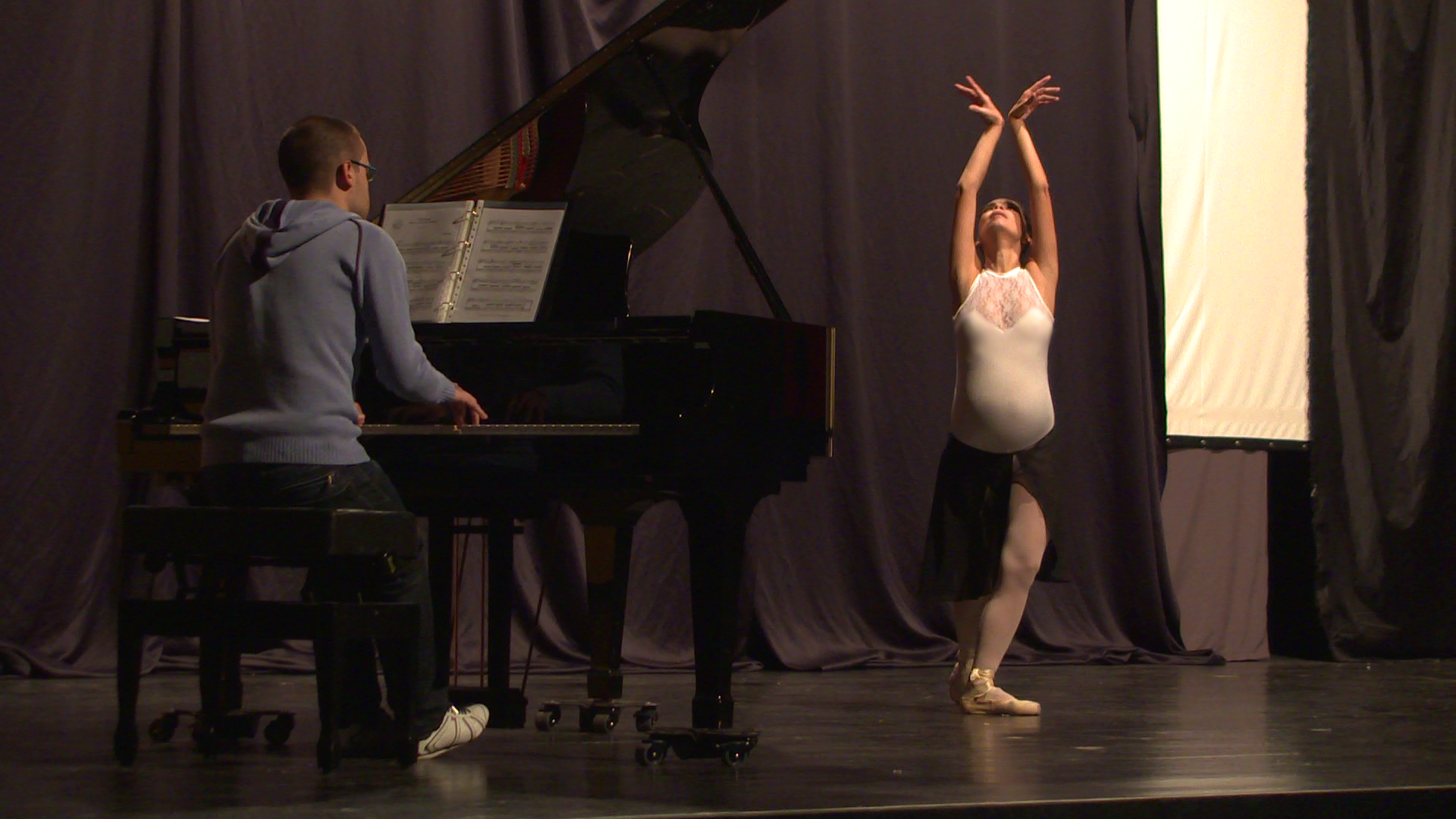 Son ya 8 meses de embarazo, el cuerpo cada día se va encaminando al parto, la danza sigue siendo parte de nuestro cotidiano, cada ensayo es un reto, el piano y el cuerpo, el dialogo. Áurea se mantiene tranquila, quizás concentrada en las variaciones.